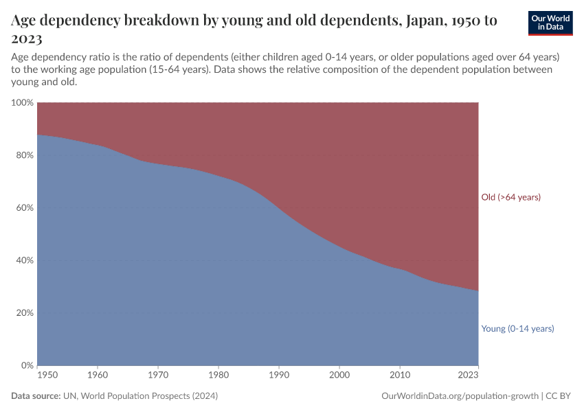 As we see, Japan has a much older population: in 2021, there were more than twice as many above 64 as there were children younger than 15. This has not always been the case, as the chart shows. Japan has aged significantly in recent decades: in 1950, there were over 7 children younger than 15 for every person above 64.