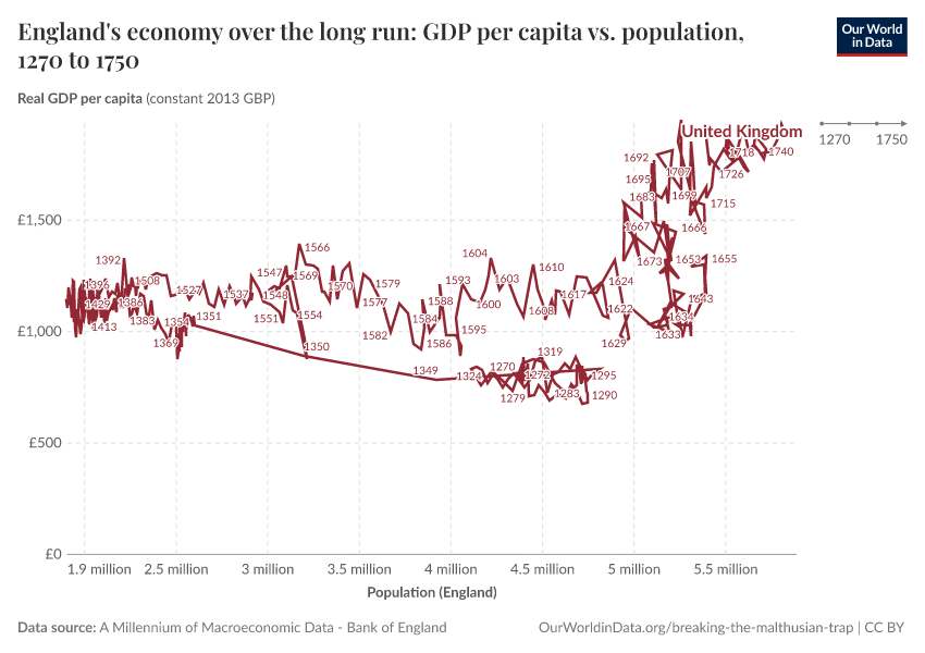 The chart above also shows when England broke out of the Malthusian trap — the first country in the world to do so. From around 1685 onwards we see what Malthus thought was impossible: the speed of innovation fueling productivity growth became so fast that both the size of the population and income per person started growing at the same time.