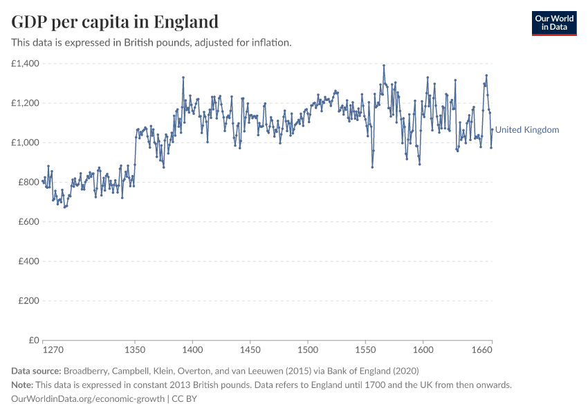 The data shown here is taken from Broadberry, Stephen, Bruce Campbell, Alexander Klein, Mark Overton and Bas van Leeuwen (2015) – British Economic Growth 1270-1870 Cambridge: Cambridge University Press. https://doi.org/10.1017/CBO9781107707603