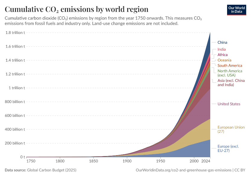 We can compare each country’s total contribution to global emissions by looking at cumulative CO2. We can calculate cumulative emissions by adding up each country’s annual CO2 emissions over time. We did this calculation for each region and the largest CO2 emitters over the period from 1751 through to 2017.3