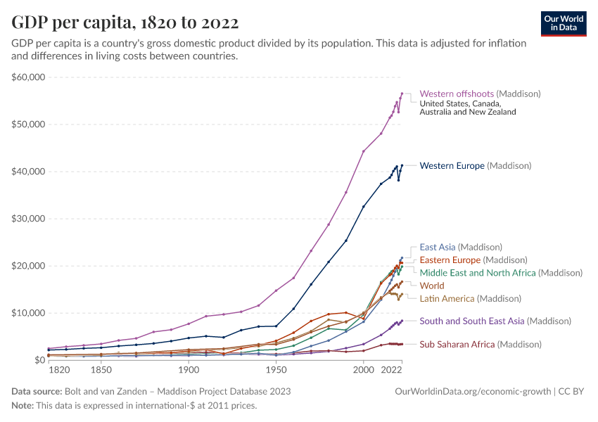 Since then, some countries have achieved very large growth — Swedes are, for example, about 30 times richer than two centuries ago — while other economies hardly grew at all. This unequal development resulted in the extremely large global inequality of today.