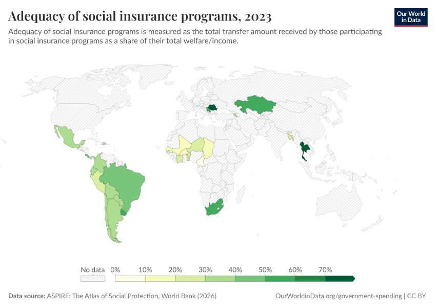 “Data Page: Adequacy of social insurance programs”. Our World in Data (2026). Data adapted from ASPIRE: The Atlas of Social Protection, World Bank. Retrieved from https://region-dods-income-groups.owid.pages.dev/grapher/adequacy-of-social-insurance-programs [online resource]How to cite this data