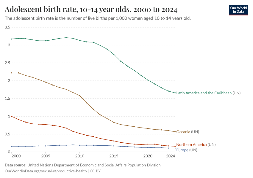 “Data Page: Adolescent birth rate, 10-14 year olds”. Our World in Data (2026). Data adapted from United Nations Department of Economic and Social Affairs Population Division. Retrieved from https://region-dods-income-groups.owid.pages.dev/grapher/adolescent-fertility [online resource]How to cite this data