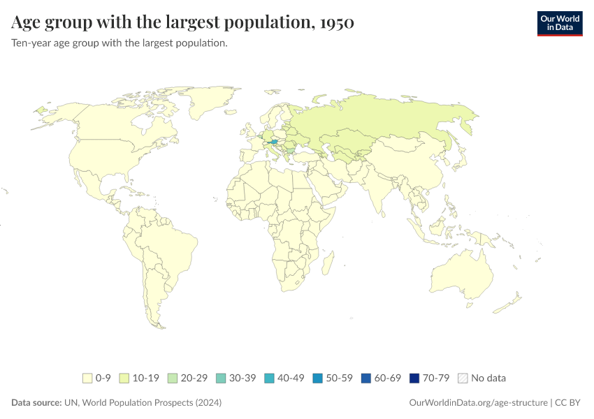 “Data Page: Ten year age-group with the highest population”. Our World in Data (2026). Data adapted from United Nations. Retrieved from https://region-dods-income-groups.owid.pages.dev/grapher/age-group-with-the-largest-population [online resource]How to cite this data