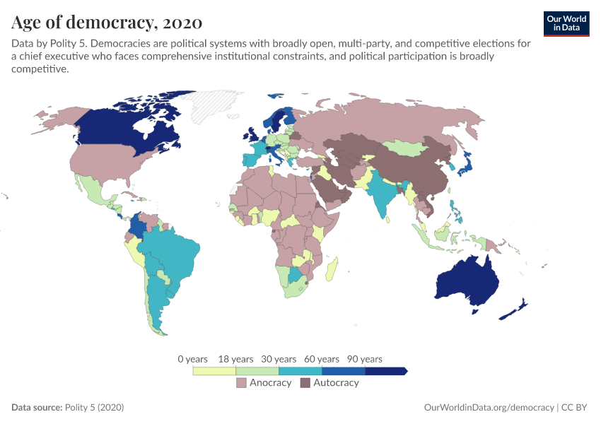 “Data Page: Age of democracy”, part of the following publication: Bastian Herre, Lucas Rodés-Guirao, and Esteban Ortiz-Ospina (2013) - “Democracy”. Data adapted from Polity 5. Retrieved from https://region-dods-income-groups.owid.pages.dev/grapher/age-of-democracy-polity [online resource]How to cite this data