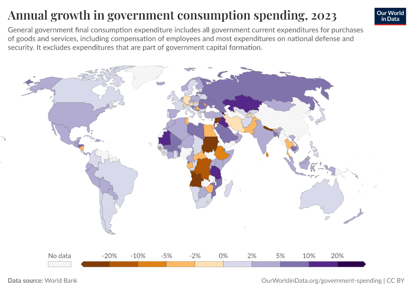 “Data Page: Annual growth in government consumption spending”. Our World in Data (2026). Data adapted from World Bank. Retrieved from https://region-dods-income-groups.owid.pages.dev/grapher/annual-growth-of-general-government-final-consumption-expenditure [online resource]How to cite this data