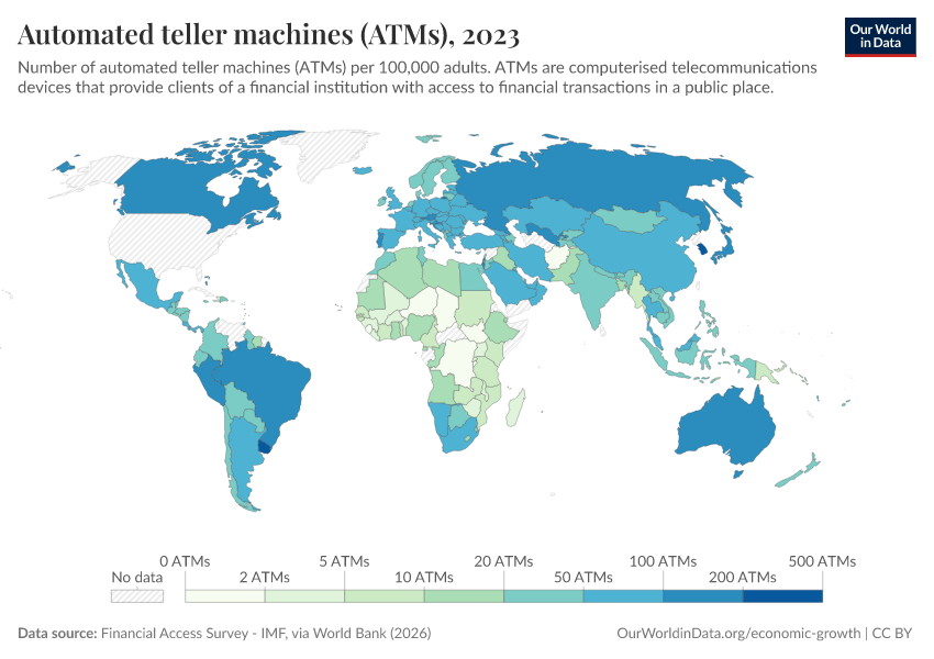 “Data Page: Automated teller machines (ATMs)”. Our World in Data (2026). Data adapted from Financial Access Survey - IMF, via World Bank. Retrieved from https://region-dods-income-groups.owid.pages.dev/grapher/automated-teller-machines-atms-per-100000-adults [online resource]How to cite this data