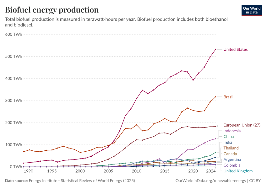 Energy Institute - Statistical Review of World Energy (2025) – with major processing by Our World in Data. “Biofuels production” [dataset]. Energy Institute, “Statistical Review of World Energy” [original data]. Retrieved February 26, 2026 from https://region-dods-income-groups.owid.pages.dev/grapher/biofuel-production
