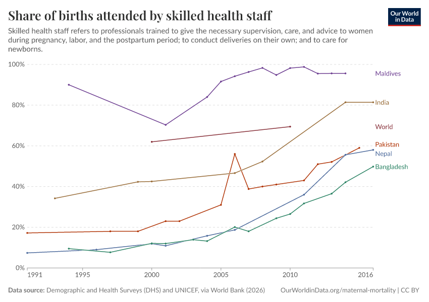 “Data Page: Share of births attended by skilled health staff”. Our World in Data (2026). Data adapted from Demographic and Health Surveys (DHS) and UNICEF, via World Bank. Retrieved from https://region-dods-income-groups.owid.pages.dev/grapher/births-attended-by-health-staff-sdgs [online resource]How to cite this data