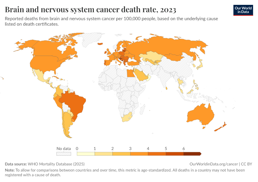 WHO Mortality Database (2025) – with minor processing by Our World in Data. “Brain and nervous system cancer death rate” [dataset]. WHO Mortality Database, “WHO Mortality Database” [original data]. Retrieved February 26, 2026 from https://region-dods-income-groups.owid.pages.dev/grapher/brain-and-nervous-system-cancer-death-rate