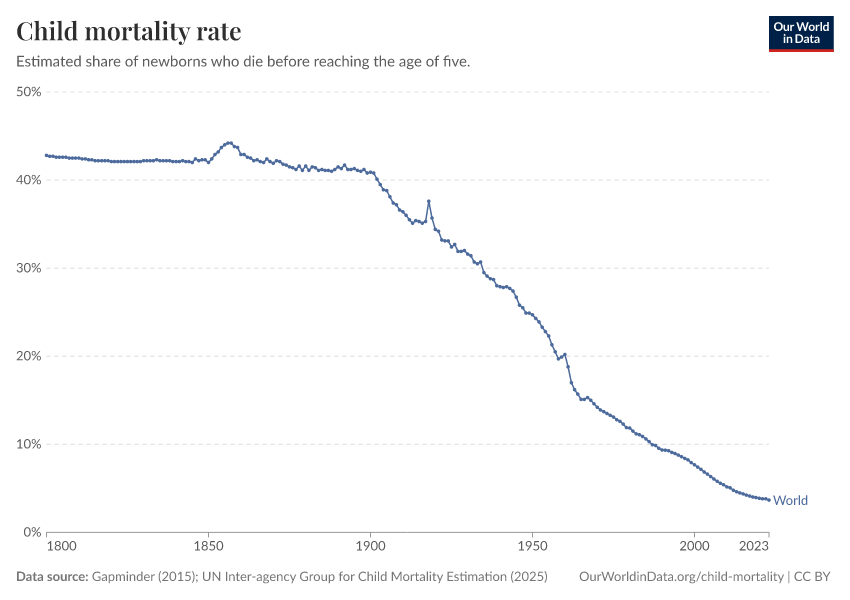 Gapminder (2015); UN Inter-agency Group for Child Mortality Estimation (2025) – processed by Our World in Data. “Child mortality rate – Gapminder; UN IGME – Long-run data” [dataset]. United Nations Inter-agency Group for Child Mortality Estimation, “United Nations Inter-agency Group for Child Mortality Estimation”; Gapminder, “Child mortality rate under age five v7”; Gapminder based on UN IGME & UN WPP, “Under-five Mortality v11”; Various sources, “Population” [original data]. Retrieved February 26, 2026 from https://region-dods-income-groups.owid.pages.dev/grapher/child-mortality