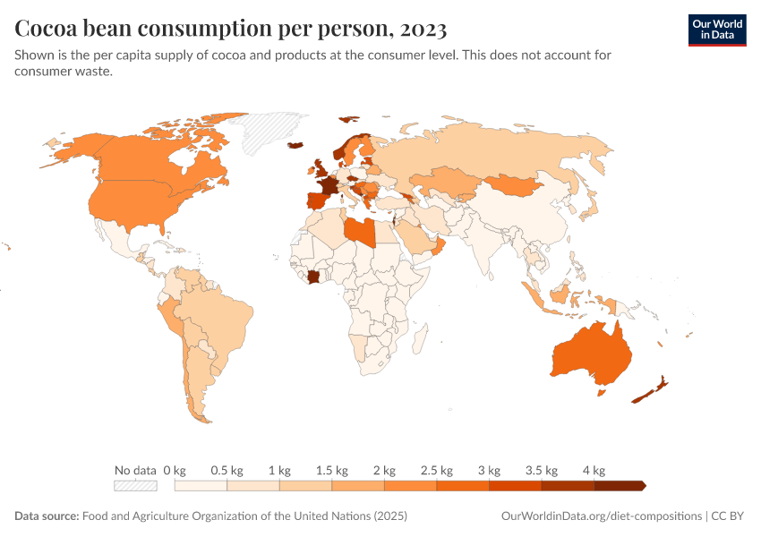 “Data Page: Yearly per capita supply of cocoa beans”. Our World in Data (2026). Data adapted from Food and Agriculture Organization of the United Nations. Retrieved from https://region-dods-income-groups.owid.pages.dev/grapher/chocolate-consumption-per-person [online resource]How to cite this data