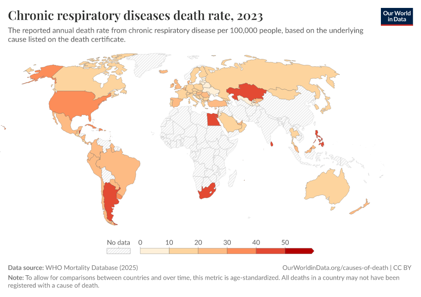 “Data Page: Chronic respiratory diseases death rate”, part of the following publication: Saloni Dattani, Fiona Spooner, Hannah Ritchie, and Max Roser (2023) - “Causes of Death”. Data adapted from WHO Mortality Database. Retrieved from https://region-dods-income-groups.owid.pages.dev/grapher/chronic-respiratory-diseases-death-rate-who-mdb [online resource]How to cite this data