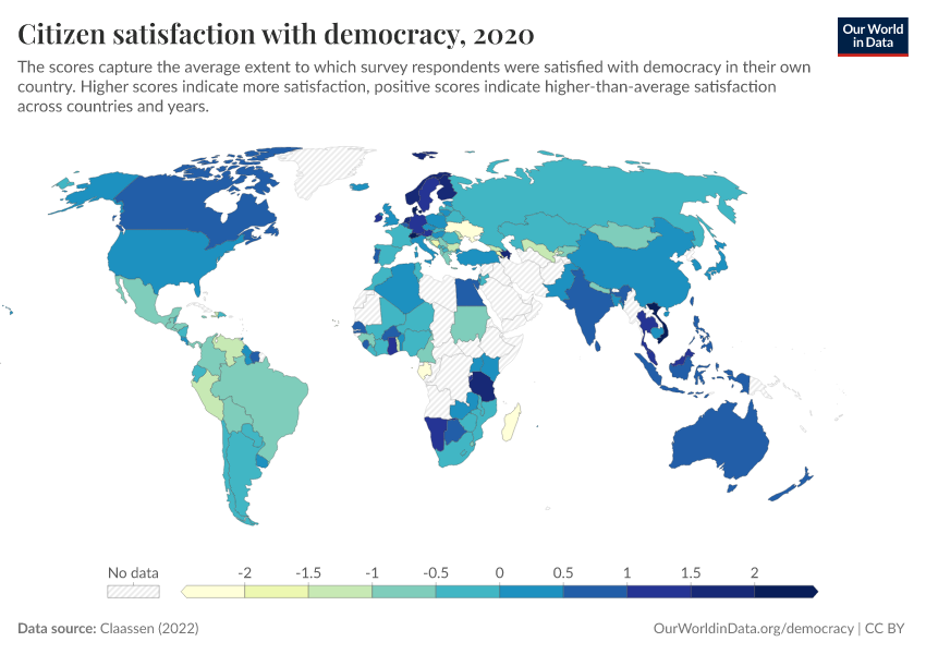 - Higher scores indicate more satisfaction. Positive scores mean that citizen satisfaction with democracy is higher than the average across all countries and years. A score of 1 means that citizen support lies one standard deviation above the average support."