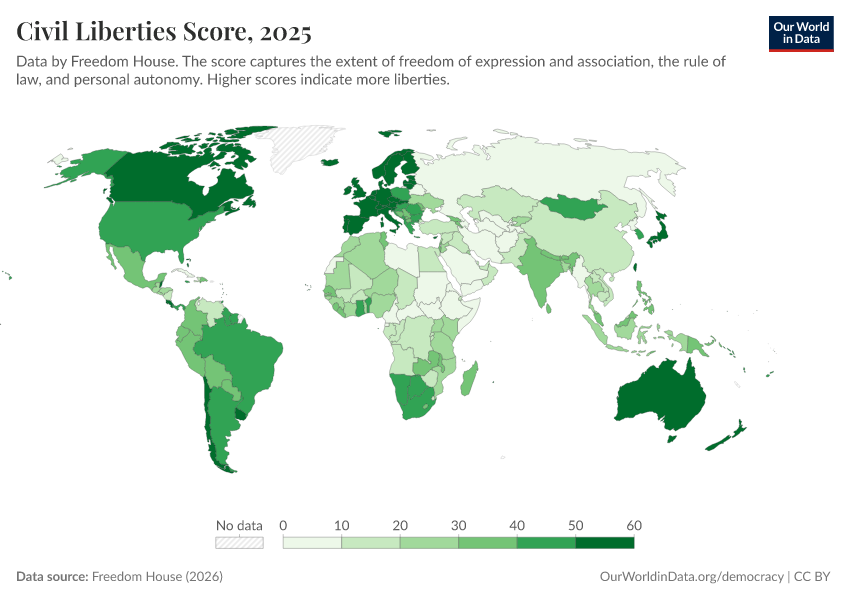 Freedom House (2025) – processed by Our World in Data. “Civil Liberties Score” [dataset]. Freedom House, “Freedom in the World” [original data]. Retrieved February 26, 2026 from https://region-dods-income-groups.owid.pages.dev/grapher/civil-liberties-score-fh