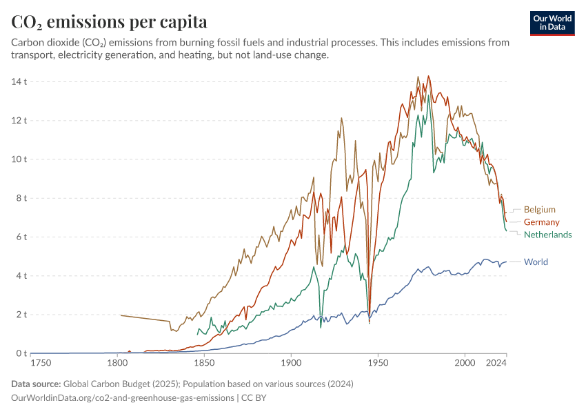 “Data Page: CO₂ emissions per capita”, part of the following publication: Hannah Ritchie, Pablo Rosado, and Max Roser (2023) - “CO₂ and Greenhouse Gas Emissions”. Data adapted from Global Carbon Project, Various sources. Retrieved from https://region-dods-income-groups.owid.pages.dev/grapher/co-emissions-per-capita [online resource]How to cite this data