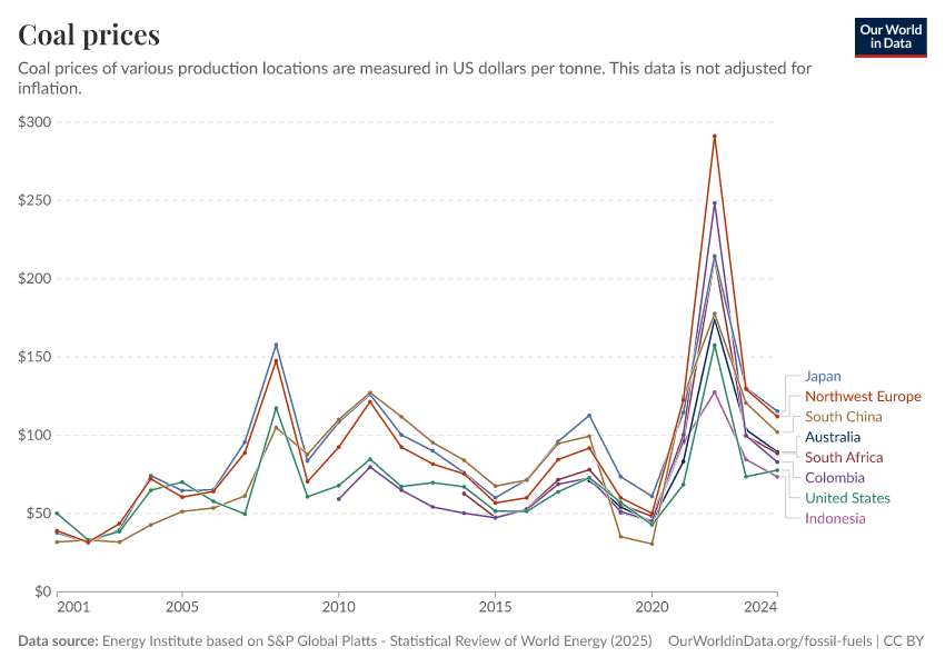“Data Page: Coal prices”, part of the following publication: Hannah Ritchie, Pablo Rosado, and Max Roser (2023) - “Energy”. Data adapted from Energy Institute. Retrieved from https://region-dods-income-groups.owid.pages.dev/grapher/coal-prices [online resource]How to cite this data