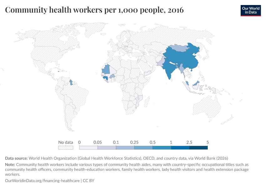 “Data Page: Community health workers per 1,000 people”. Our World in Data (2026). Data adapted from World Health Organization (Global Health Workforce Statistics), OECD, and country data, via World Bank. Retrieved from https://region-dods-income-groups.owid.pages.dev/grapher/community-health-workers [online resource]How to cite this data