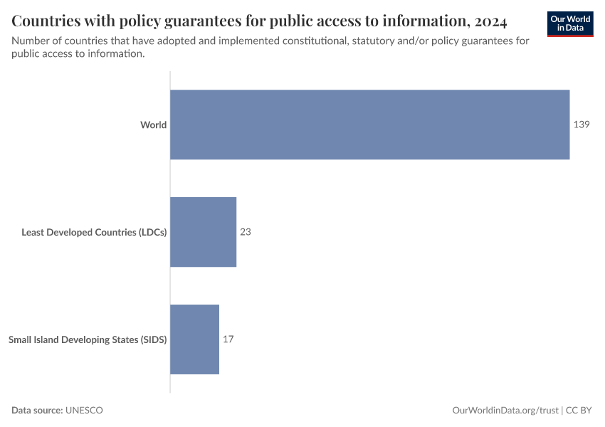 “Data Page: Countries with policy guarantees for public access to information”. Our World in Data (2026). Data adapted from UNESCO. Retrieved from https://region-dods-income-groups.owid.pages.dev/grapher/countries-that-adopt-guarantees-for-public-access-to-information [online resource]How to cite this data