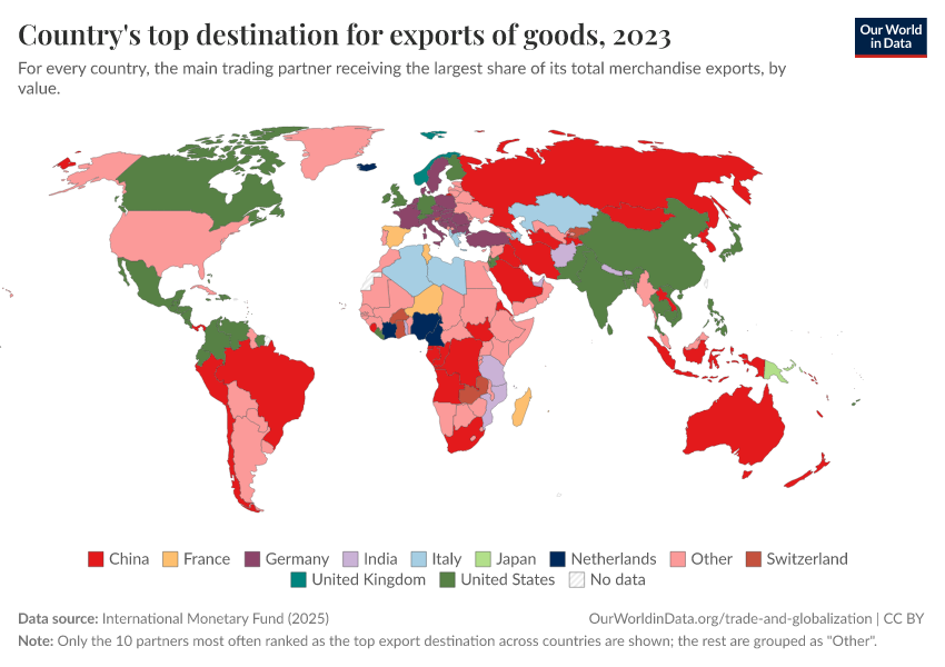 International Monetary Fund (2025) – with major processing by Our World in Data. “Top export partner category” [dataset]. International Monetary Fund, “International Trade in Goods (by partner country) (IMTS)” [original data]. Retrieved February 26, 2026 from https://region-dods-income-groups.owid.pages.dev/grapher/countrys-top-destination-for-exports-of-goods