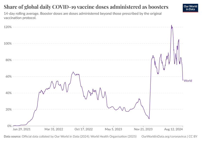 Official data collated by Our World in Data (2024); World Health Organisation (2025) – with major processing by Our World in Data. “Share of global daily COVID-19 vaccine doses administered as boosters” [dataset]. Official data collated by Our World in Data, “COVID-19, vaccinations”; World Health Organisation, “COVID-19, vaccinations (WHO)” [original data]. Retrieved February 26, 2026 from https://region-dods-income-groups.owid.pages.dev/grapher/covid-vaccine-share-boosters