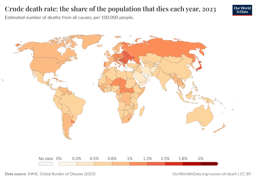 “Data Page: Crude death rate: the share of the population that dies each year”, part of the following publication: Esteban Ortiz-Ospina and Max Roser (2016) - “Global Health”. Data adapted from IHME, Global Burden of Disease. Retrieved from https://region-dods-income-groups.owid.pages.dev/grapher/crude-death-rate-the-share-of-the-population-that-dies-each-year-gbd [online resource]How to cite this data
