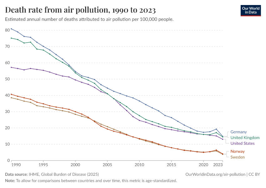 “Data Page: Death rate from air pollution”, part of the following publication: Esteban Ortiz-Ospina and Max Roser (2016) - “Global Health”. Data adapted from IHME, Global Burden of Disease. Retrieved from https://region-dods-income-groups.owid.pages.dev/grapher/death-rate-from-air-pollution-per-100000 [online resource]