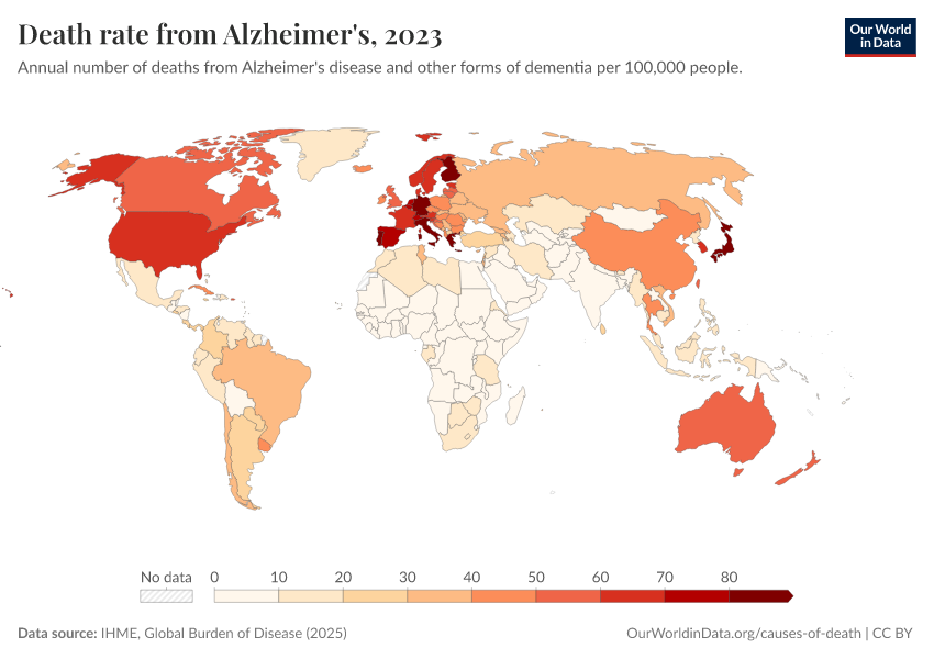 “Data Page: Death rate from Alzheimer's”, part of the following publication: Esteban Ortiz-Ospina and Max Roser (2016) - “Global Health”. Data adapted from IHME, Global Burden of Disease. Retrieved from https://region-dods-income-groups.owid.pages.dev/grapher/death-rate-from-alzheimers-other-dementias-gbd [online resource]How to cite this data