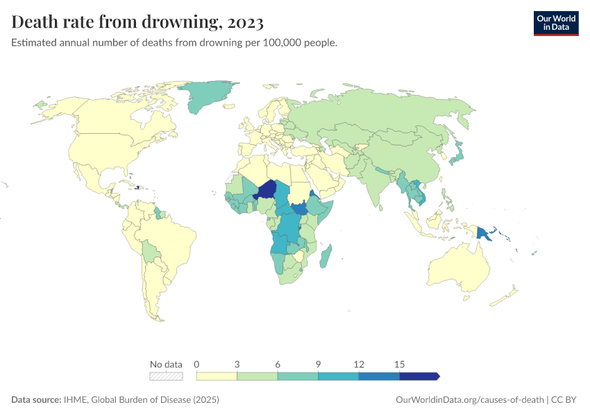 “Data Page: Death rate from drowning”, part of the following publication: Esteban Ortiz-Ospina and Max Roser (2016) - “Global Health”. Data adapted from IHME, Global Burden of Disease. Retrieved from https://region-dods-income-groups.owid.pages.dev/grapher/death-rate-from-drowning [online resource]How to cite this data