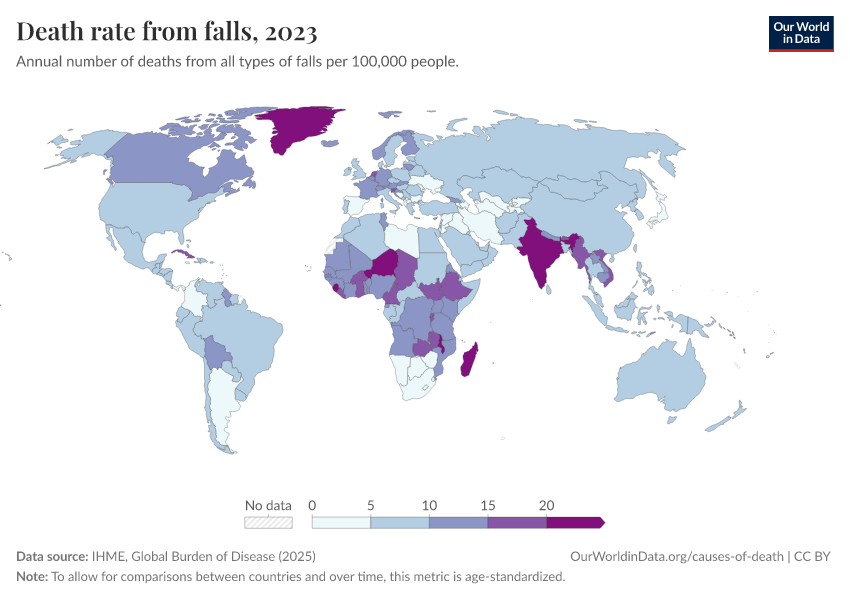 “Data Page: Death rate from falls”, part of the following publication: Esteban Ortiz-Ospina and Max Roser (2016) - “Global Health”. Data adapted from IHME, Global Burden of Disease. Retrieved from https://region-dods-income-groups.owid.pages.dev/grapher/death-rate-from-falls-gbd [online resource]How to cite this data