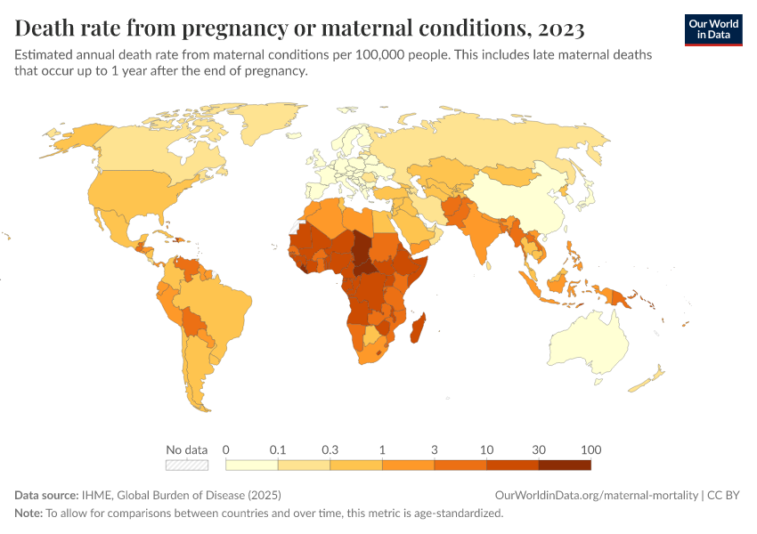 “Data Page: Death rate from pregnancy or maternal conditions”, part of the following publication: Esteban Ortiz-Ospina and Max Roser (2016) - “Global Health”. Data adapted from IHME, Global Burden of Disease. Retrieved from https://region-dods-income-groups.owid.pages.dev/grapher/death-rate-from-maternal-disorders-ihme [online resource]How to cite this data