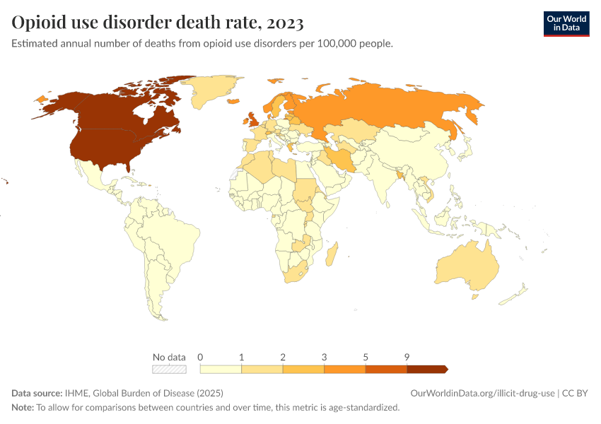 “Data Page: Opioid use disorder death rate”, part of the following publication: Esteban Ortiz-Ospina and Max Roser (2016) - “Global Health”. Data adapted from IHME, Global Burden of Disease. Retrieved from https://region-dods-income-groups.owid.pages.dev/grapher/death-rate-from-opioid-use [online resource]How to cite this data