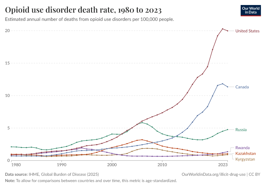 “Data Page: Opioid use disorder death rate”, part of the following publication: Esteban Ortiz-Ospina and Max Roser (2016) - “Global Health”. Data adapted from IHME, Global Burden of Disease. Retrieved from https://region-dods-income-groups.owid.pages.dev/grapher/death-rate-from-opioid-use [online resource]How to cite this data