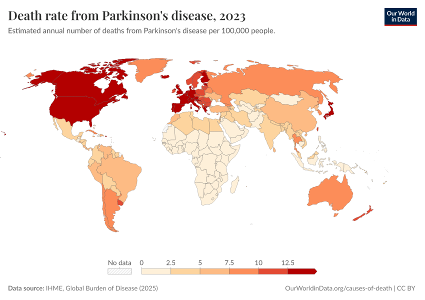 “Data Page: Death rate from Parkinson's disease”, part of the following publication: Esteban Ortiz-Ospina and Max Roser (2016) - “Global Health”. Data adapted from IHME, Global Burden of Disease. Retrieved from https://region-dods-income-groups.owid.pages.dev/grapher/death-rate-from-parkinsons-disease-gbd [online resource]How to cite this data