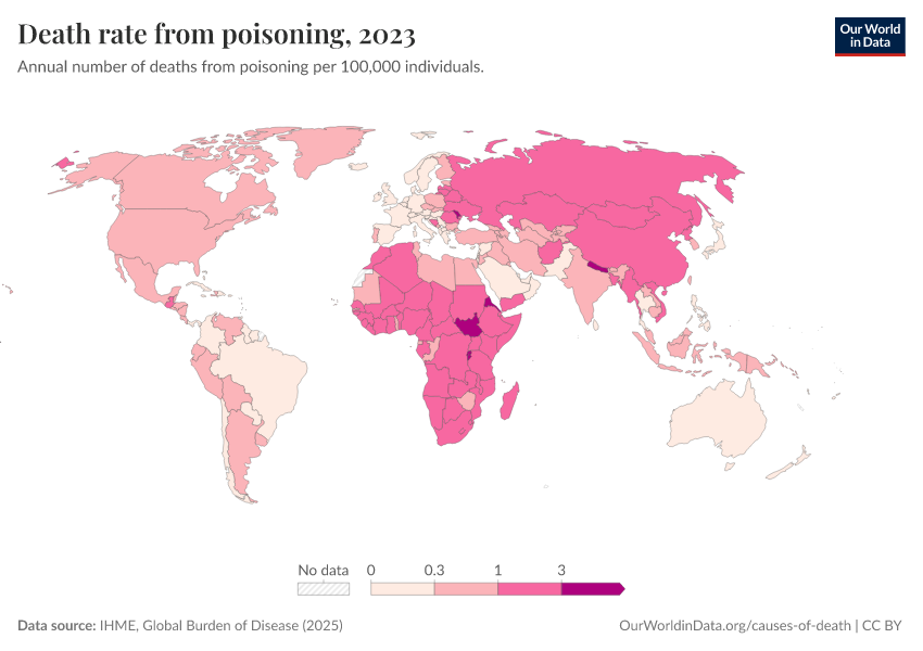“Data Page: Death rate from poisoning”, part of the following publication: Esteban Ortiz-Ospina and Max Roser (2016) - “Global Health”. Data adapted from IHME, Global Burden of Disease. Retrieved from https://region-dods-income-groups.owid.pages.dev/grapher/death-rate-from-poisoning-gbd [online resource]How to cite this data