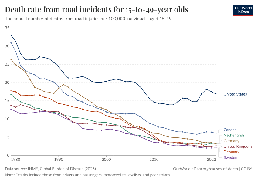 IHME, Global Burden of Disease (2025) – with major processing by Our World in Data. “Death rate from road incidents for 15-to-49-year olds” [dataset]. IHME, Global Burden of Disease, “Global Burden of Disease - Deaths” [original data]. Retrieved February 26, 2026 from https://region-dods-income-groups.owid.pages.dev/grapher/death-rate-from-road-accidents-for-15--to-49-year-olds
