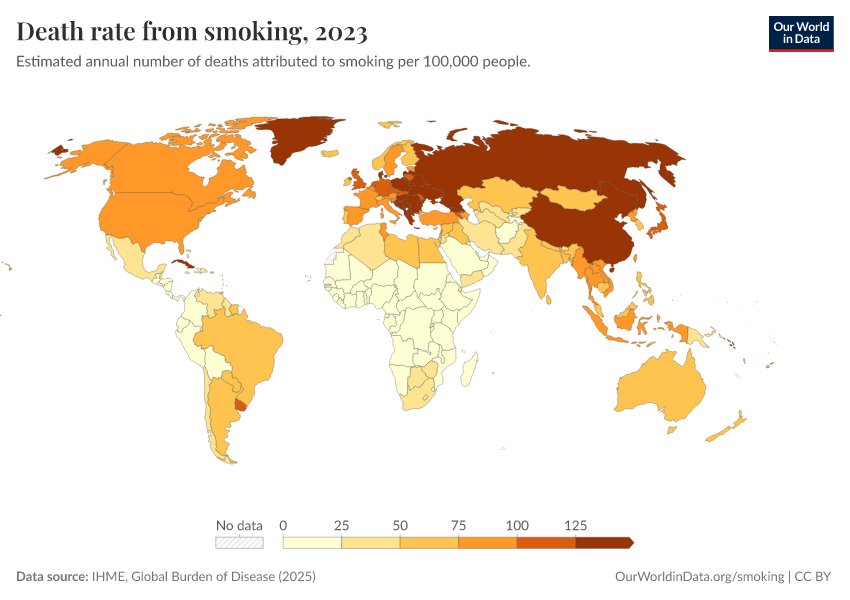 “Data Page: Death rate from smoking”, part of the following publication: Esteban Ortiz-Ospina and Max Roser (2016) - “Global Health”. Data adapted from IHME, Global Burden of Disease. Retrieved from https://region-dods-income-groups.owid.pages.dev/grapher/death-rate-from-smoking [online resource]How to cite this data