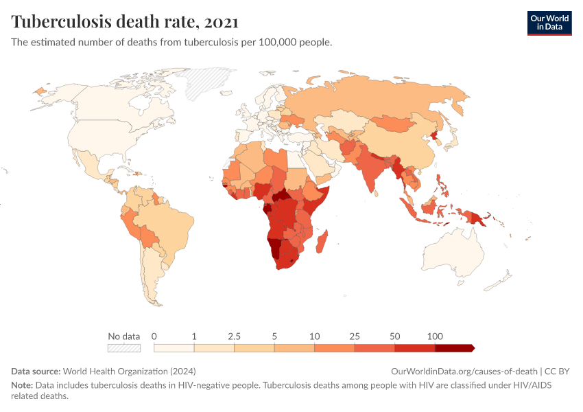 “Data Page: Tuberculosis death rate”, part of the following publication: Esteban Ortiz-Ospina and Max Roser (2016) - “Global Health”. Data adapted from World Health Organization. Retrieved from https://region-dods-income-groups.owid.pages.dev/grapher/death-rate-from-tuberculosis-ghe [online resource]How to cite this data