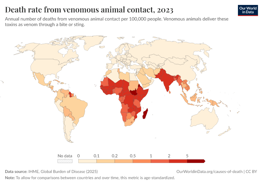 IHME, Global Burden of Disease (2025) – with major processing by Our World in Data. “Death rate from venomous animal contact” [dataset]. IHME, Global Burden of Disease, “Global Burden of Disease - Deaths” [original data]. Retrieved February 26, 2026 from https://region-dods-income-groups.owid.pages.dev/grapher/death-rate-from-venomous-animal