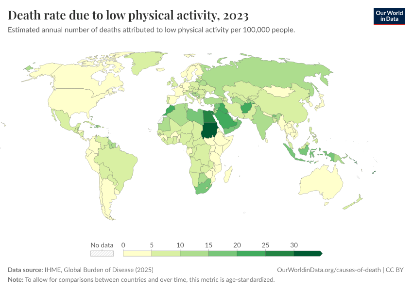 “Data Page: Death rate due to low physical activity”, part of the following publication: Esteban Ortiz-Ospina and Max Roser (2016) - “Global Health”. Data adapted from IHME, Global Burden of Disease. Retrieved from https://region-dods-income-groups.owid.pages.dev/grapher/death-rates-due-to-low-physical-activity [online resource]How to cite this data