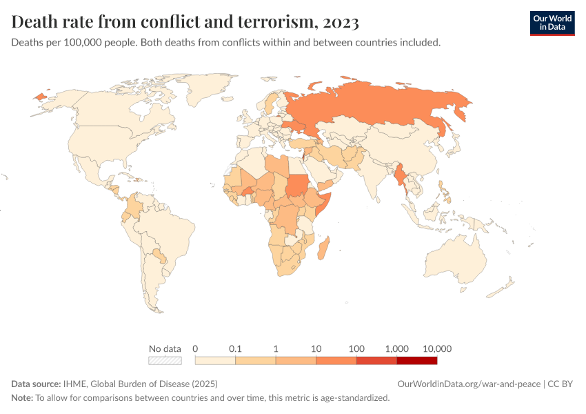 “Data Page: Death rate from conflict and terrorism”, part of the following publication: Esteban Ortiz-Ospina and Max Roser (2016) - “Global Health”. Data adapted from IHME, Global Burden of Disease. Retrieved from https://region-dods-income-groups.owid.pages.dev/grapher/death-rates-from-conflict-and-terrorism-gbd [online resource]How to cite this data