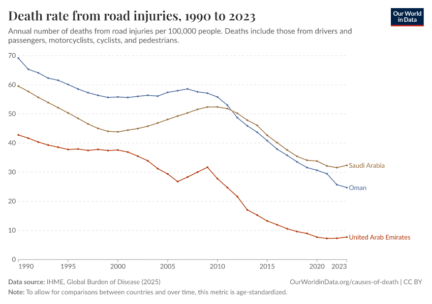 “Data Page: Death rate from road injuries”, part of the following publication: Esteban Ortiz-Ospina and Max Roser (2016) - “Global Health”. Data adapted from IHME, Global Burden of Disease. Retrieved from https://region-dods-income-groups.owid.pages.dev/grapher/death-rates-road-incidents [online resource]How to cite this data