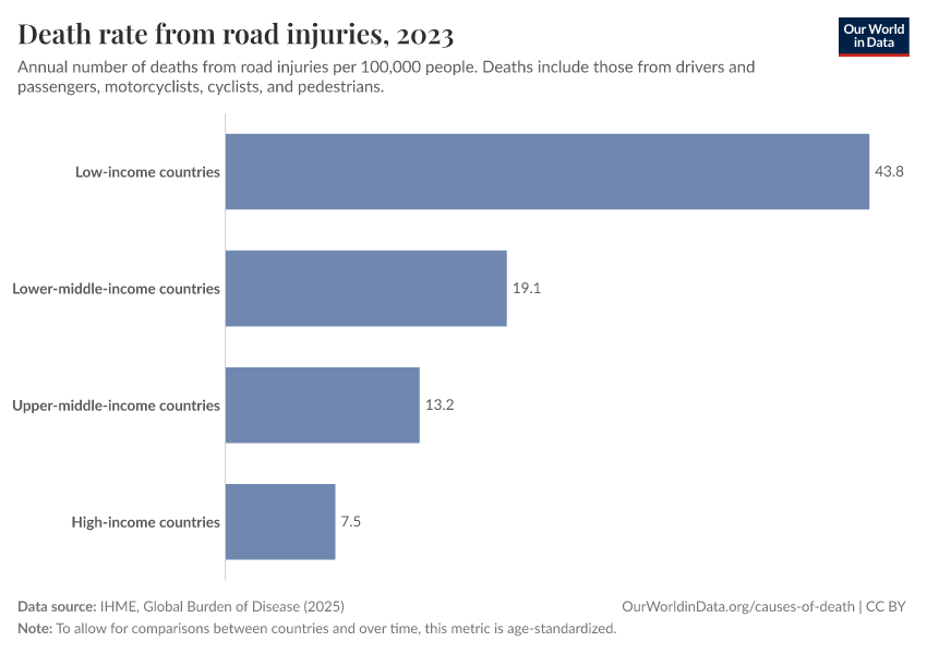 “Data Page: Death rate from road injuries”, part of the following publication: Esteban Ortiz-Ospina and Max Roser (2016) - “Global Health”. Data adapted from IHME, Global Burden of Disease. Retrieved from https://region-dods-income-groups.owid.pages.dev/grapher/death-rates-road-incidents [online resource]