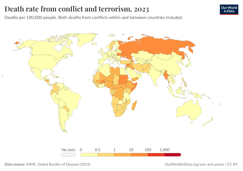 “Data Page: Death rate from conflict and terrorism”, part of the following publication: Esteban Ortiz-Ospina and Max Roser (2016) - “Global Health”. Data adapted from IHME, Global Burden of Disease. Retrieved from https://region-dods-income-groups.owid.pages.dev/grapher/deaths-conflict-terrorism-per-100000 [online resource]How to cite this data