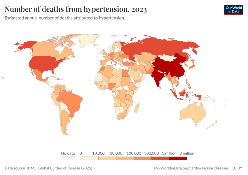 “Data Page: Number of deaths from hypertension”, part of the following publication: Esteban Ortiz-Ospina and Max Roser (2016) - “Global Health”. Data adapted from IHME, Global Burden of Disease. Retrieved from https://region-dods-income-groups.owid.pages.dev/grapher/deaths-due-to-high-blood-pressure [online resource]How to cite this data