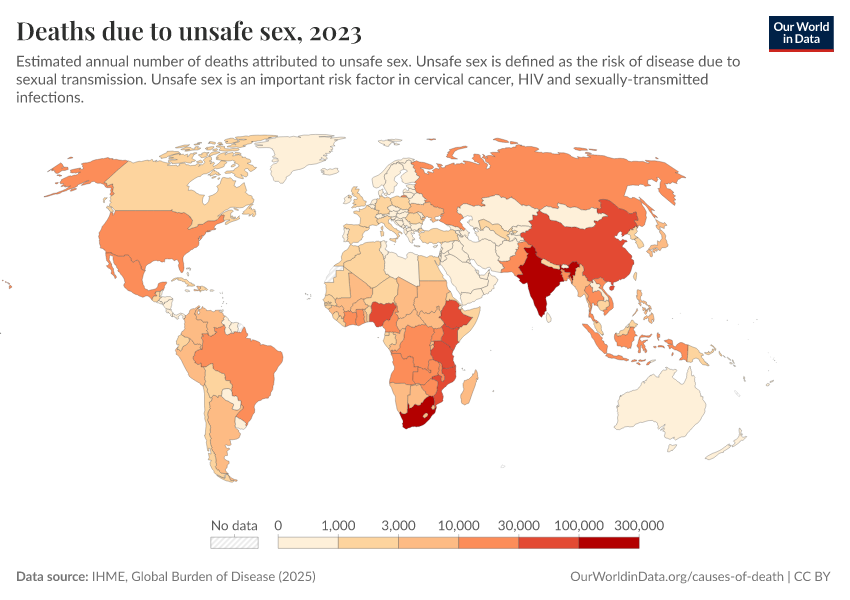 “Data Page: Deaths due to unsafe sex”, part of the following publication: Esteban Ortiz-Ospina and Max Roser (2016) - “Global Health”. Data adapted from IHME, Global Burden of Disease. Retrieved from https://region-dods-income-groups.owid.pages.dev/grapher/deaths-due-to-unsafe-sex [online resource]How to cite this data