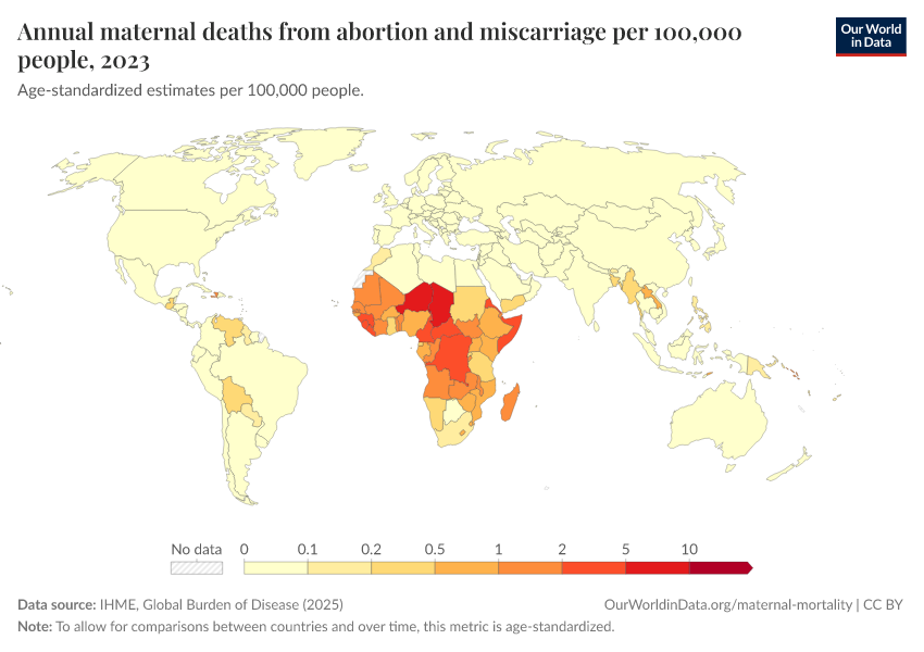 IHME, Global Burden of Disease (2025) – with major processing by Our World in Data. “Annual maternal deaths from abortion and miscarriage per 100,000 people” [dataset]. IHME, Global Burden of Disease, “Global Burden of Disease - Deaths” [original data]. Retrieved February 26, 2026 from https://region-dods-income-groups.owid.pages.dev/grapher/deaths-from-abortion-and-miscarriage-per-100000-people