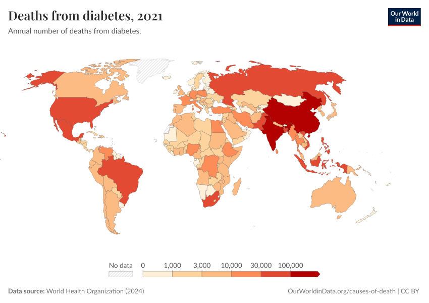 “Data Page: Deaths from diabetes”, part of the following publication: Esteban Ortiz-Ospina and Max Roser (2016) - “Global Health”. Data adapted from World Health Organization. Retrieved from https://region-dods-income-groups.owid.pages.dev/grapher/deaths-from-diabetes-ghe [online resource]How to cite this data