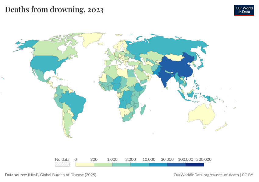 “Data Page: Deaths from drowning”, part of the following publication: Esteban Ortiz-Ospina and Max Roser (2016) - “Global Health”. Data adapted from IHME, Global Burden of Disease. Retrieved from https://region-dods-income-groups.owid.pages.dev/grapher/deaths-from-drowning [online resource]How to cite this data
