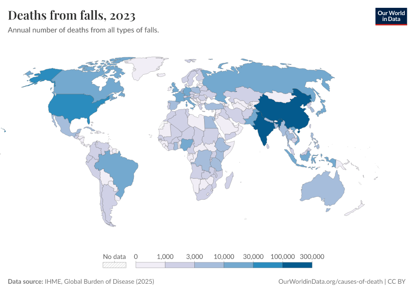“Data Page: Deaths from falls”, part of the following publication: Esteban Ortiz-Ospina and Max Roser (2016) - “Global Health”. Data adapted from IHME, Global Burden of Disease. Retrieved from https://region-dods-income-groups.owid.pages.dev/grapher/deaths-from-falls-gbd [online resource]How to cite this data